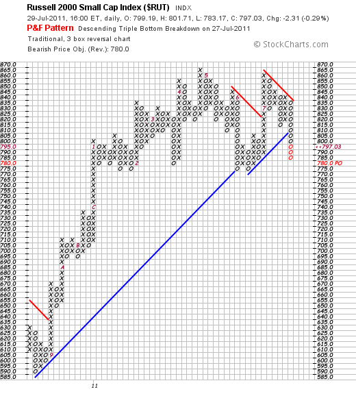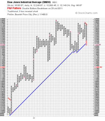 In the Point and Figure Chart of the Dow Jones Industrials (DIA) above, we can see how a “sell” signal was generated on July 25th with a downside price objective of 11,400.